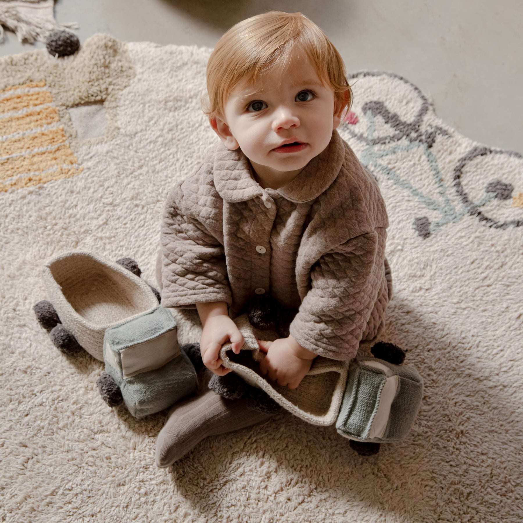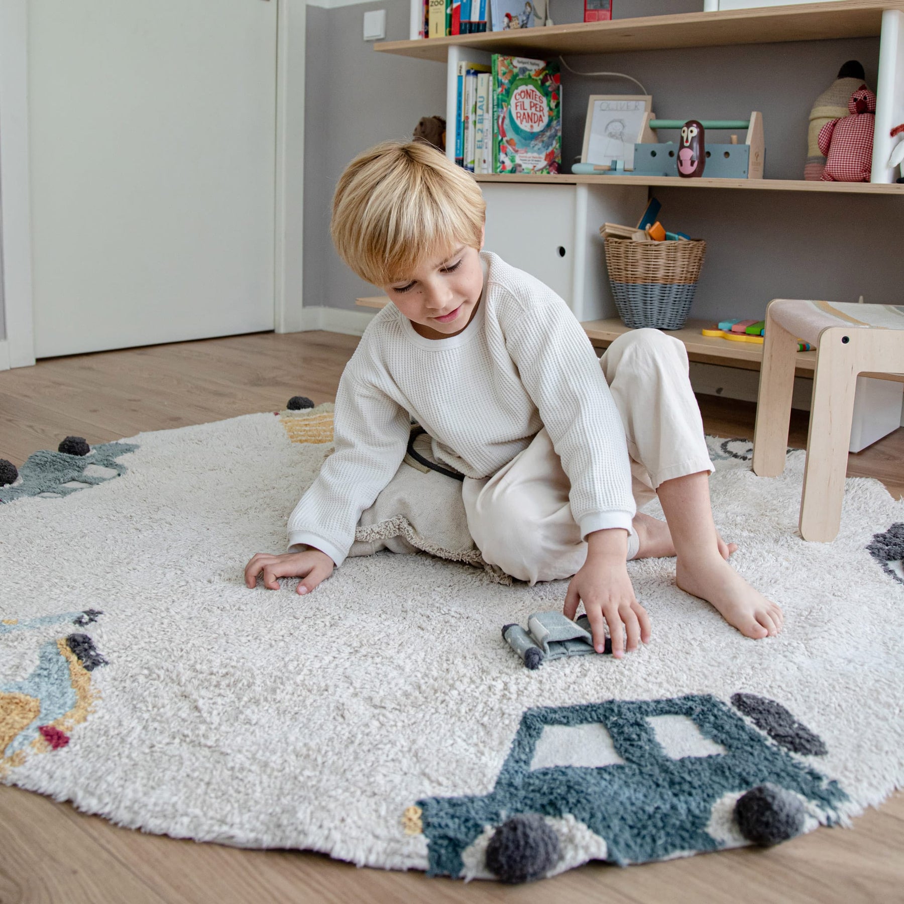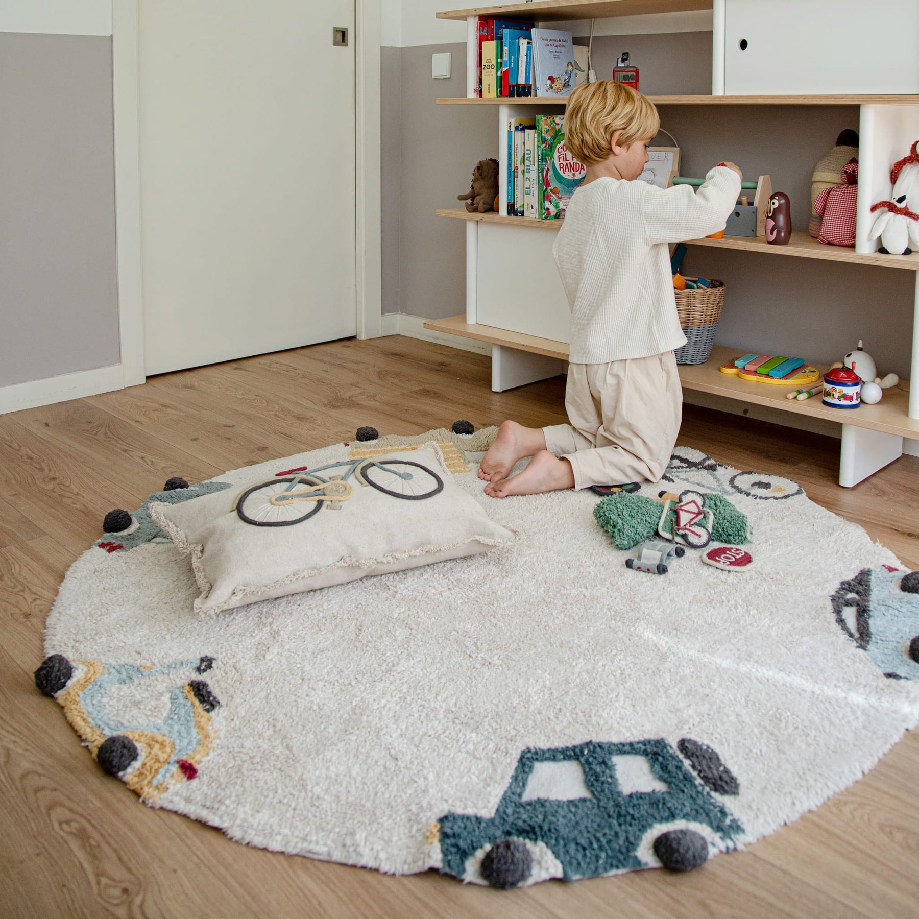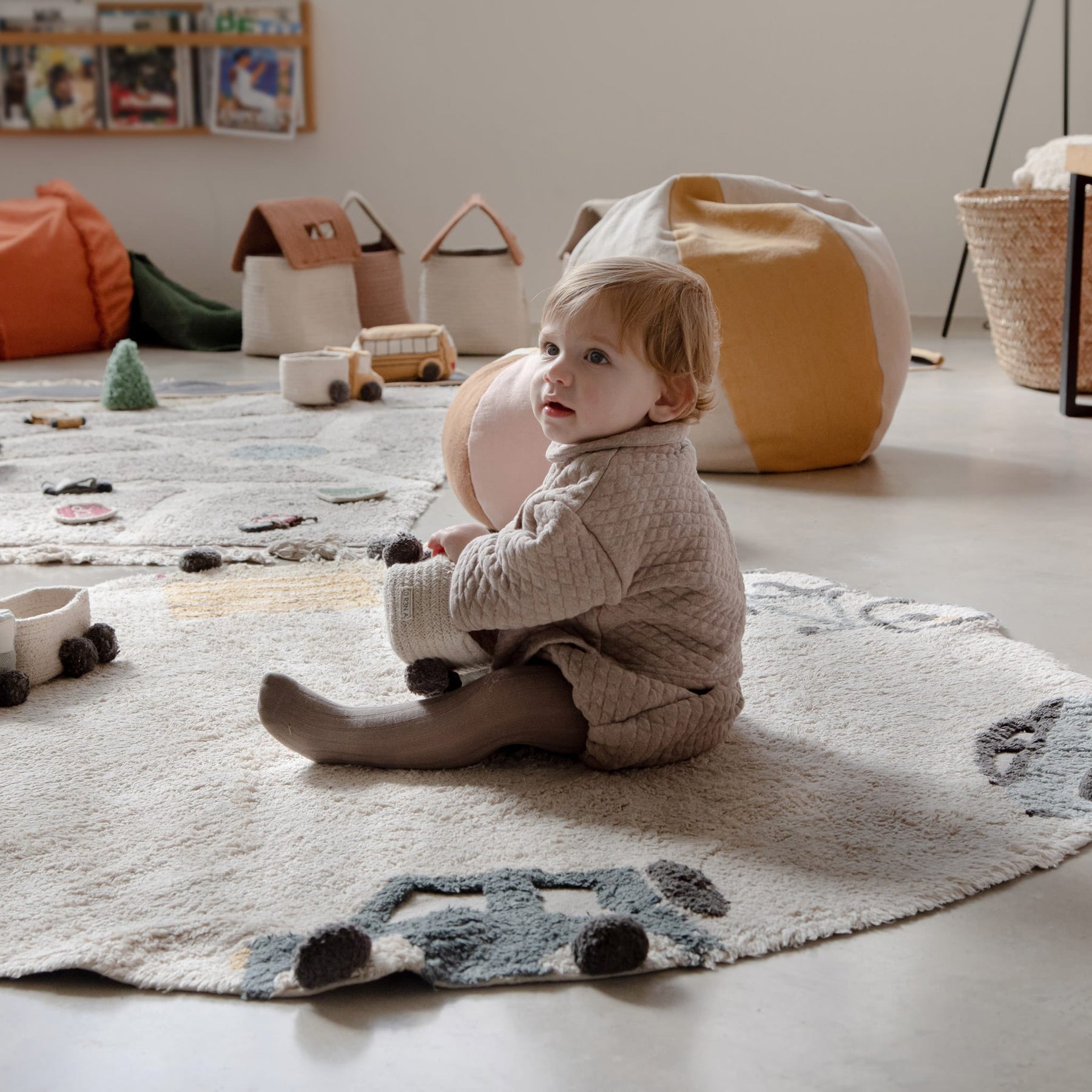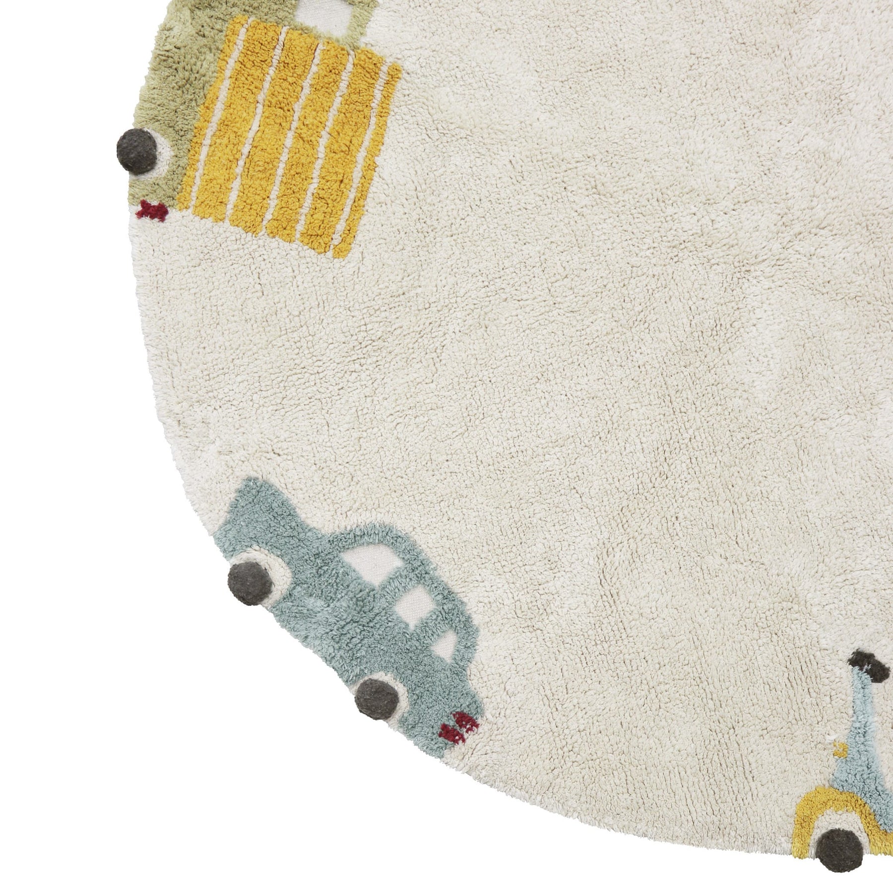 Mit dem runden maschinenwaschbaren Baumwollteppich “Wheels” wird Ihr Kind die verschiedenen Fahrzeuge kennenlernen! Als wunderschönes dekoratives Detail passt der runde Teppich in der schönen Beigefarbe in jedes Zimmer des Hauses. Der multifunktionale, interessante und äußerst praktische Teppich mit Fahrzeugen am Rande bietet viele Einsatzmöglichkeiten. Er eignet sich als Spielmatte, als dekoratives Detail oder als Vorleger vor dem Bett. Er besteht aus Baumwolle, was ihn extrem weich und warm und somit ideal für kalte Tage macht. Die Baumwolle macht den Teppich aber auch sehr praktisch in den Sommermonaten, weil er leicht ist und das Raumklima durch Naturmaterialien reguliert wird. Das Teppichunikat “Wheels” wurde komplett in Handarbeit hergestellt und schafft eine aktive und angenehme Atmosphäre im Raum. Der Fahrzeug-Teppich ist wunderbar mit dem tollen Bodenkissen “Bike” und Aufbewahrungskörbchen “Truck” von Lorena Canals kombinierbar!