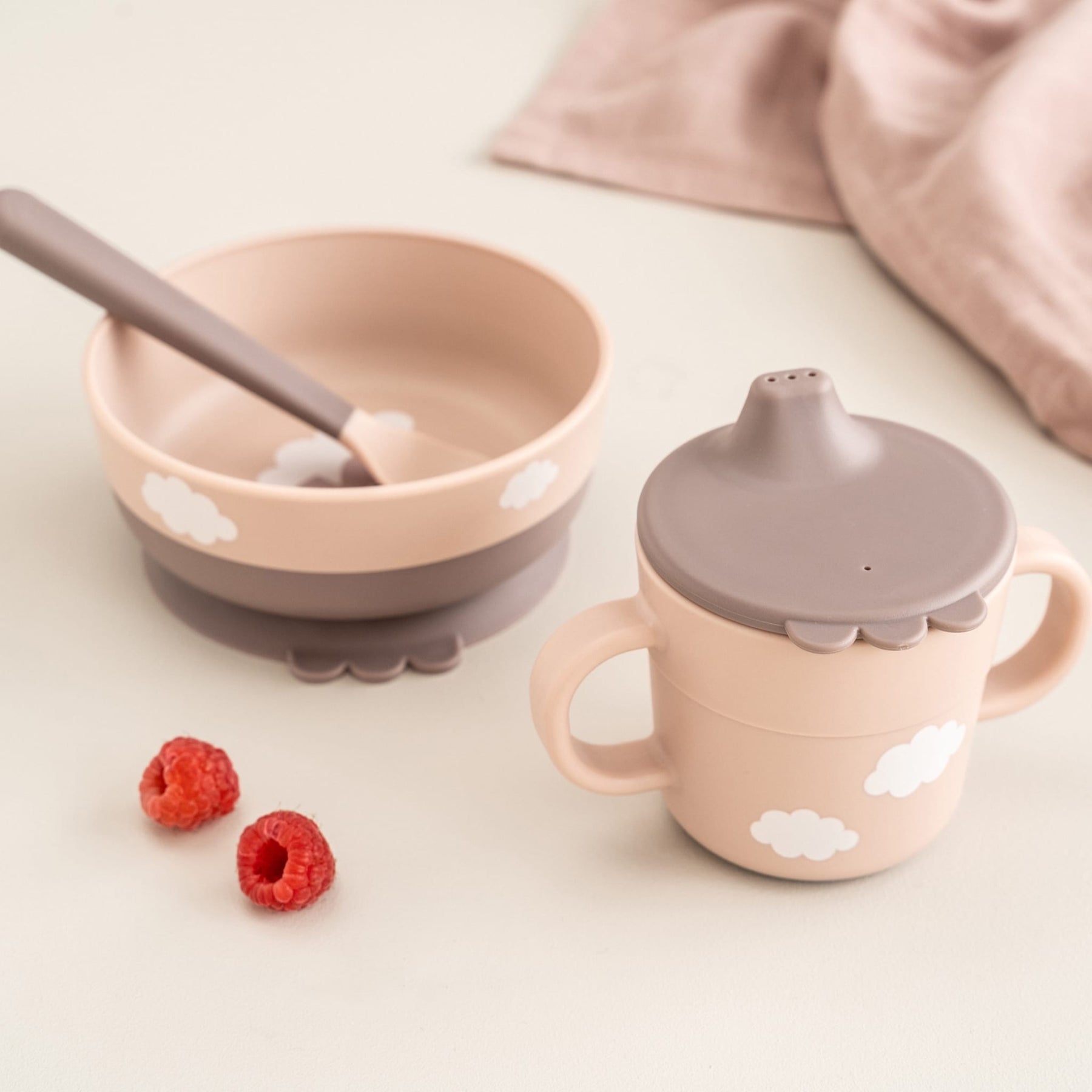Kleine Kinder werden jede Mahlzeit mit dem niedlichen Geschirrset "Foodie Happy Clouds / Green" von Done by Deer genießen. Es enthält eine Schüssel, einen Becher und einen Löffel. Die Schüssel verfügt über einen praktischen Saugnapf, der sie sicher an Ort und Stelle hält. Der ergonomisch geformte Löffel erleichtert das Füttern Ihres Kindes sowie seine selbstständigen Essversuche. Der Becher ist mit einer Schnabeldecke und zwei Griffen ausgestattet. Das Geschirrset ist speziell für den täglichen Gebrauch mit Kleinkindern entwickelt und kann sowohl in der Spülmaschine als auch in der Mikrowelle verwendet werden. Nachdem das Set seine Aufgabe erfüllt hat, kann es recycelt und zu neuen Alltagsprodukten umgewandelt werden. Das rosa Geschirr-Set ist mit einem fröhlichen Wolkenmuster verziert. Die Schüssel zeigt den fliegenden Ozzo, während auf dem Becher Birdee am Himmel zu sehen ist.