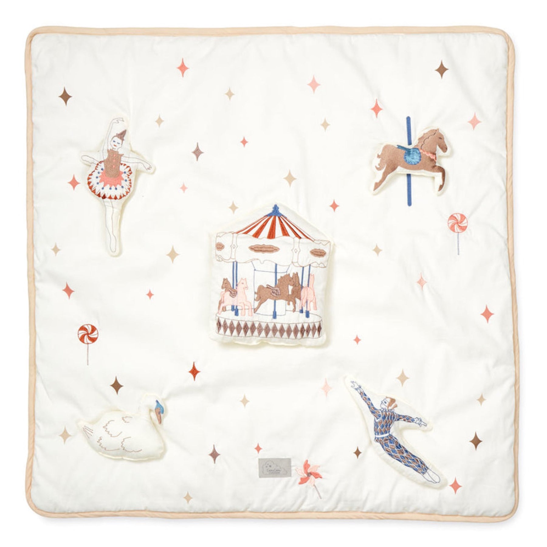 Der Cam Cam Copenhagen Activity Playmat – Carousel verzaubert mit seinem nostalgischen Jahrmarkt-Thema und lädt Ihr Baby zu einer magischen Entdeckungsreise ein. Die liebevoll gestaltete Spielmatte begeistert mit zarten Stickereien und Applikationen rund um Karussellpferd, Ballerina, Harlekin, Schwan und ein bezauberndes Karussell-Mittelteil – eingerahmt von funkelnden Sternen und süßen Candy-Details.