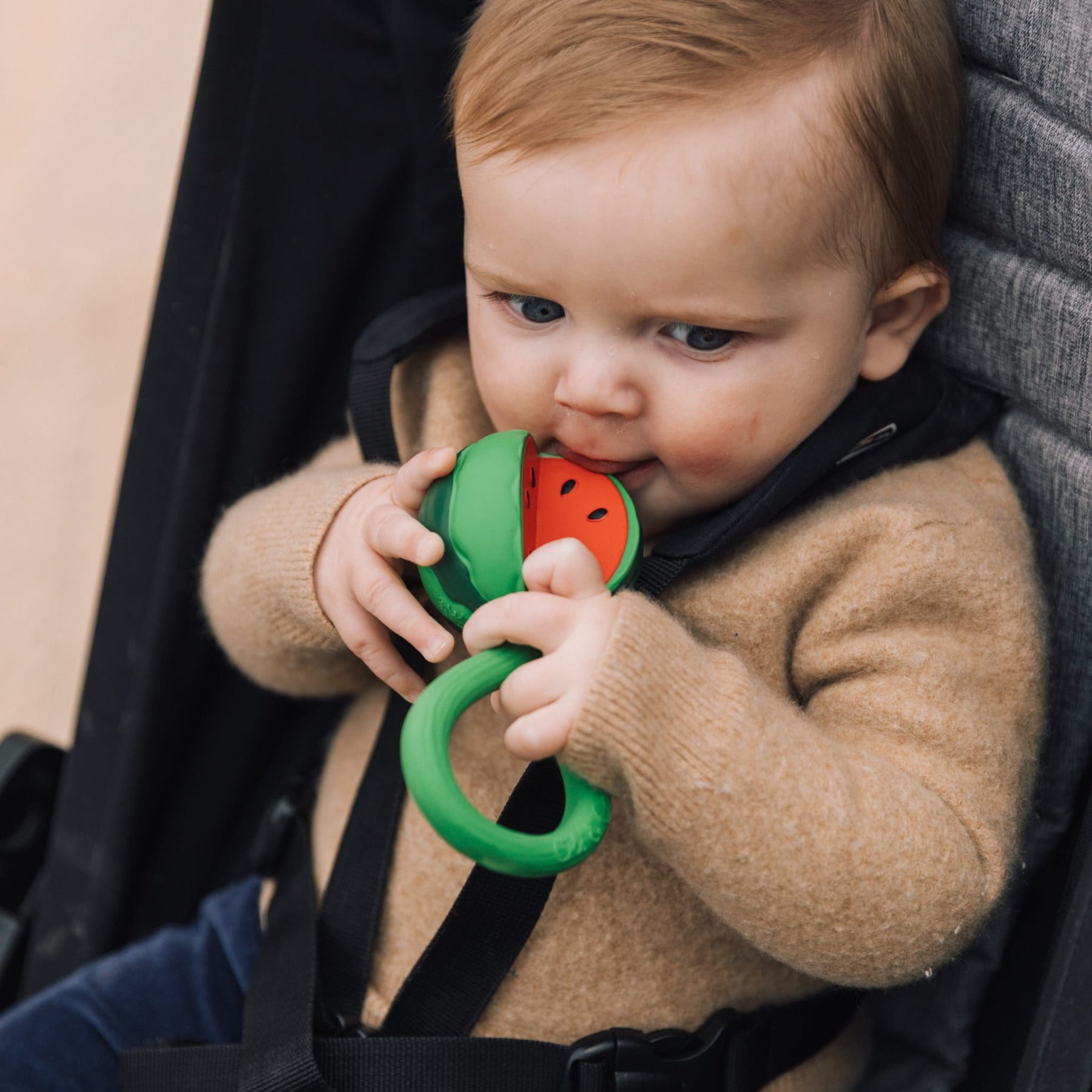 Die Watermelon Rattle von Oli&Carol ist eine nachhaltige 2-in-1-Innovation: Beißring und Rassel in Form einer frischen Wassermelone! Außen besteht sie aus 100 % natürlichem Kautschuk, innen sorgen upgecycelte Kirschkerne für einen sanften Klang. In Zusammenarbeit mit HNO-Ärzten entwickelt, wurde das Klangprofil so abgestimmt, dass es beruhigend wirkt – perfekt zum Einschlafen oder für entspannte Momente unterwegs. Die handbemalte Oberfläche, die angenehme Haptik und die liebevollen Details machen dieses Spielzeug zu einem idealen Begleiter für Babys erste Entdeckungsreisen.