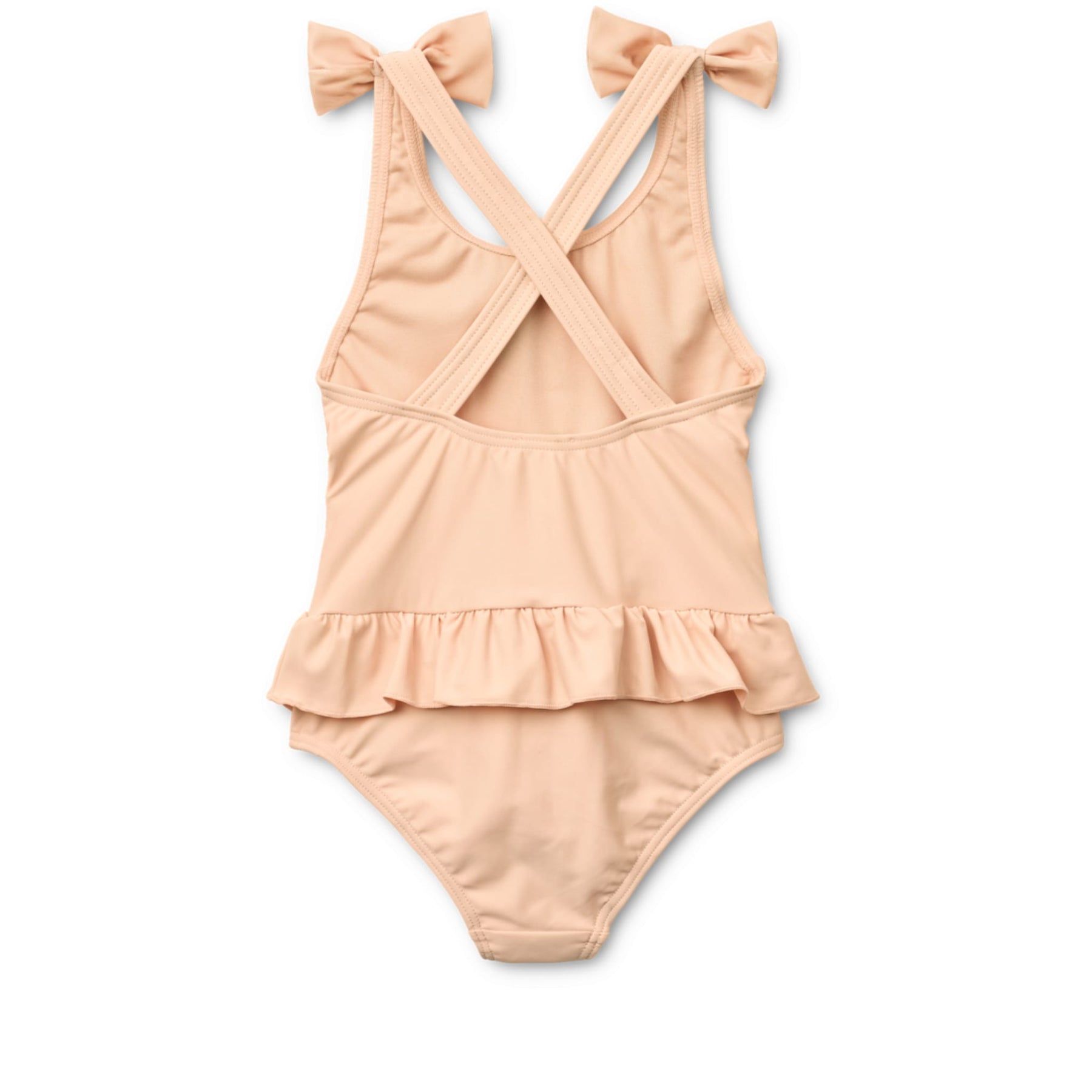 Das schnelltrocknende, weiche und elastische Material sorgt für hohen Tragekomfort, während der Badeanzug dank vollständigem Futter angenehm auf der Haut liegt. Ein angesetzter Volant an der Taille verleiht dem Design eine verspielte Note. Die gekreuzten Träger mit Schleifendetail an der Schulter runden den Look liebevoll ab.