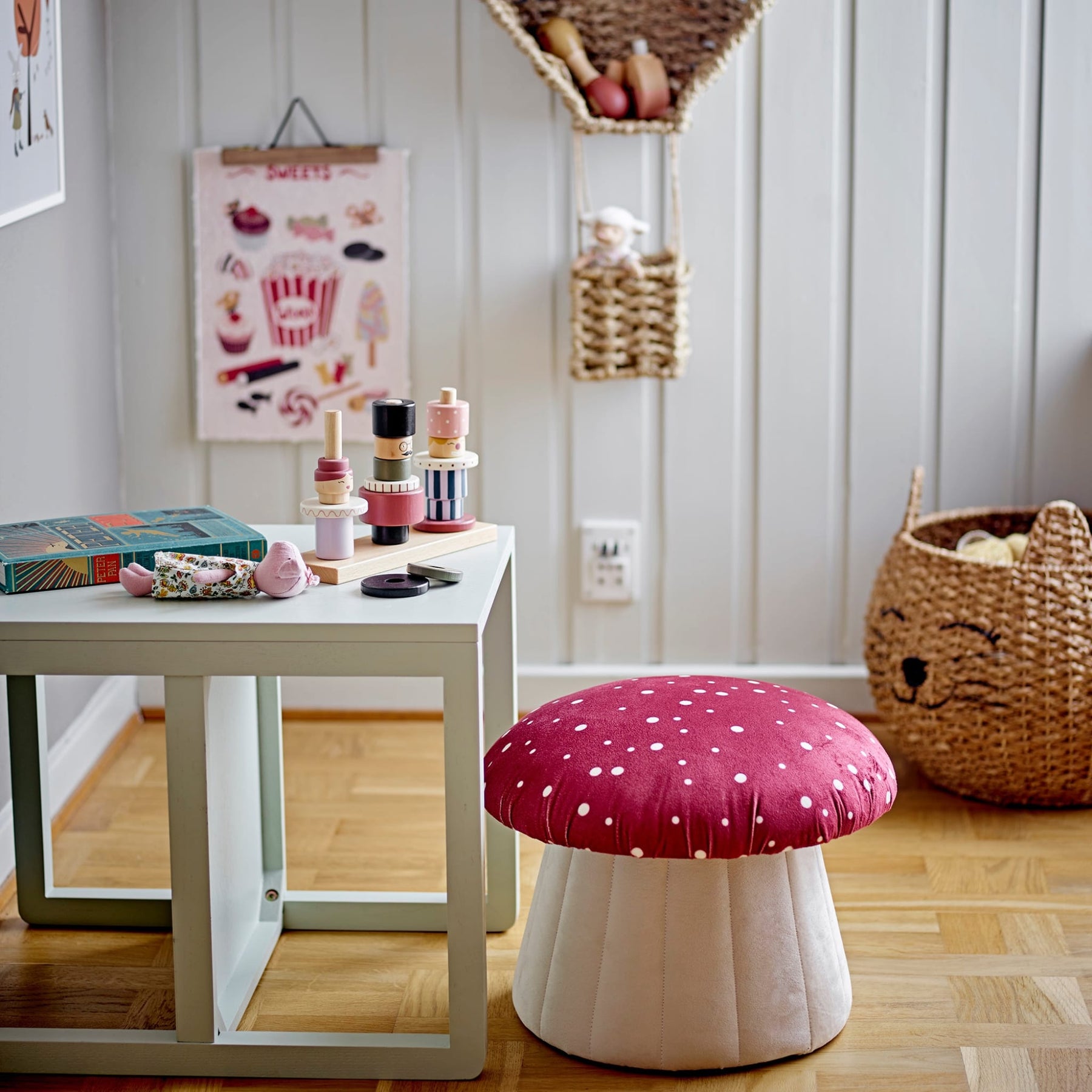 Der Sitzpuff "Bertil" von Bloomingville Mini ist ein fluffiges Plätzchen für kleine Abenteurer, wo Spaß und Bequemlichkeit Hand in Hand gehen! Seine Einsatzmöglichkeiten sind vielfältig – sei es als erhöhter Sitzplatz, als Stuhl oder einfach als stilvolles Deko-Element. Inspiriert von der Form eines Pilzes, fügt dieser Sitzpuff eine spielerische und fantasievolle Nuance in den Raum ein. Der strukturierte, in warmen Rottönen gehaltene Stoff schafft eine sanfte Oberfläche, die dem Pouf im Kinderzimmer eine besonders gemütliche Ausstrahlung verleiht. Nicht allein auf funktionaler Ebene überzeugend, sondern auch ästhetisch ansprechend, integriert er eine subtile Mischung aus Komfort und naturnaher Inspiration in die Raumgestaltung.