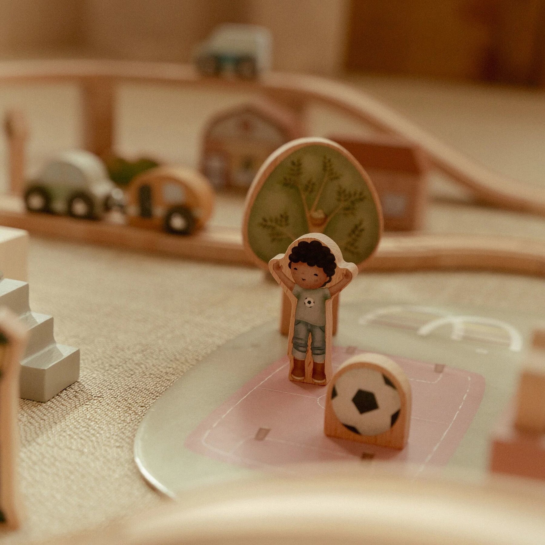 Die detailreichen Holzteile lassen sich leicht kombinieren und regen zu stundenlangem, kreativem Spielen an. Kinder können den Zug über die Brücke fahren lassen, am Bahnhof halten oder die Stadt erkunden. Die Möglichkeiten sind nahezu grenzenlos.