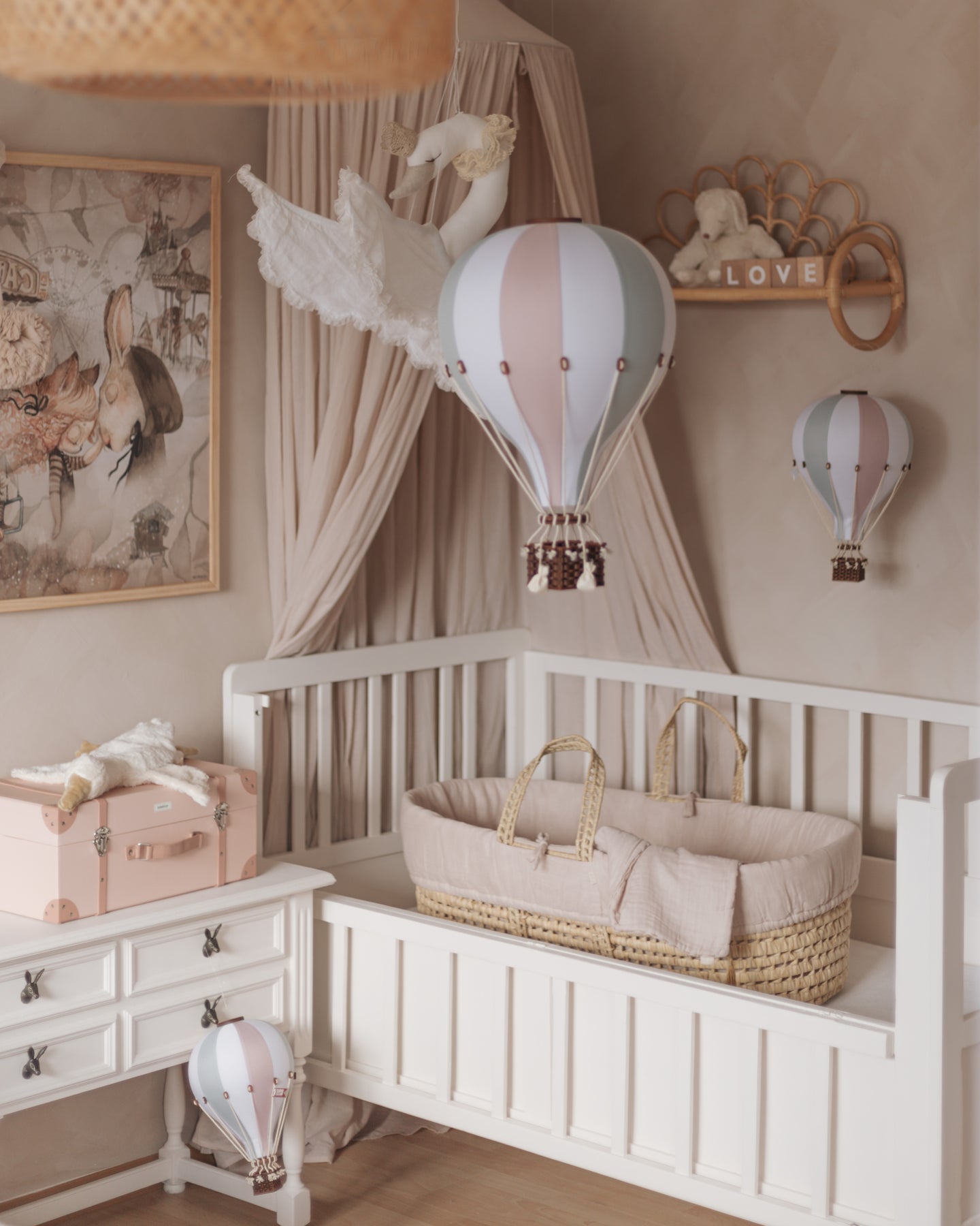 Der Heißluftballon ist ein ganz besonderes Dekostück im Kinderzimmer. Darüber hinaus eignet er sich zu verschiedenen Anlässen – zum Kindergeburtstag oder zum Verschenken. Dieses Einrichtungsdetail schafft eine zauberhafte Atmosphäre und ist deshalb bei der Raumgestaltung ein echter Hingucker. Der handgefertigte Heißluftballon “Altrosa / Hellgrau / Weiß“ von Super Balloon ist in drei verschiedenen Farbkombinationen erhältlich. Er überzeugt mit seinem stabilen Material, seiner zarten Farbmischung und einzelnen Elementen. Der Ballon-Korb wird aus Holz hergestellt, genauso wie der obere Ballonabschluss auf der Oberseite des Ballons, an dem die Fäden befestigt sind. Den Korb können Sie verzieren und individuell gestalten, wie etwa mit einem kleinen Papierschmetterling. Der Ballon hat im Inneren einen kugelförmigen Gummischlauch, muss manuell mit einer separat erhältlichen Ballpumpe aufgeblasen und von Zeit zu Zeit wegen des Luftverlustes auch nachgepumpt werden. Der Ballon ist ganz leicht und lässt sich einfach an einer Angelschnur befestigen.