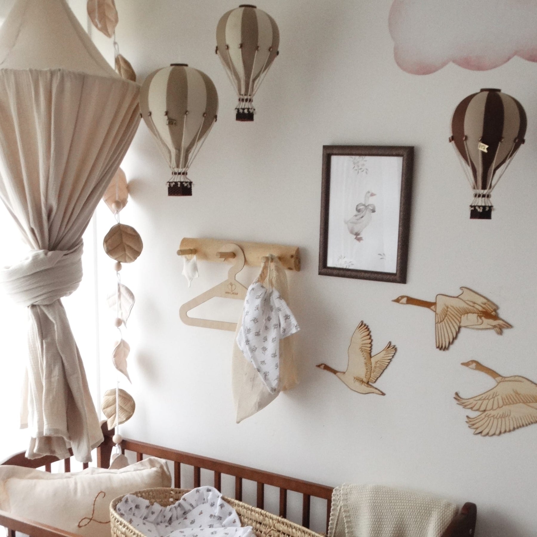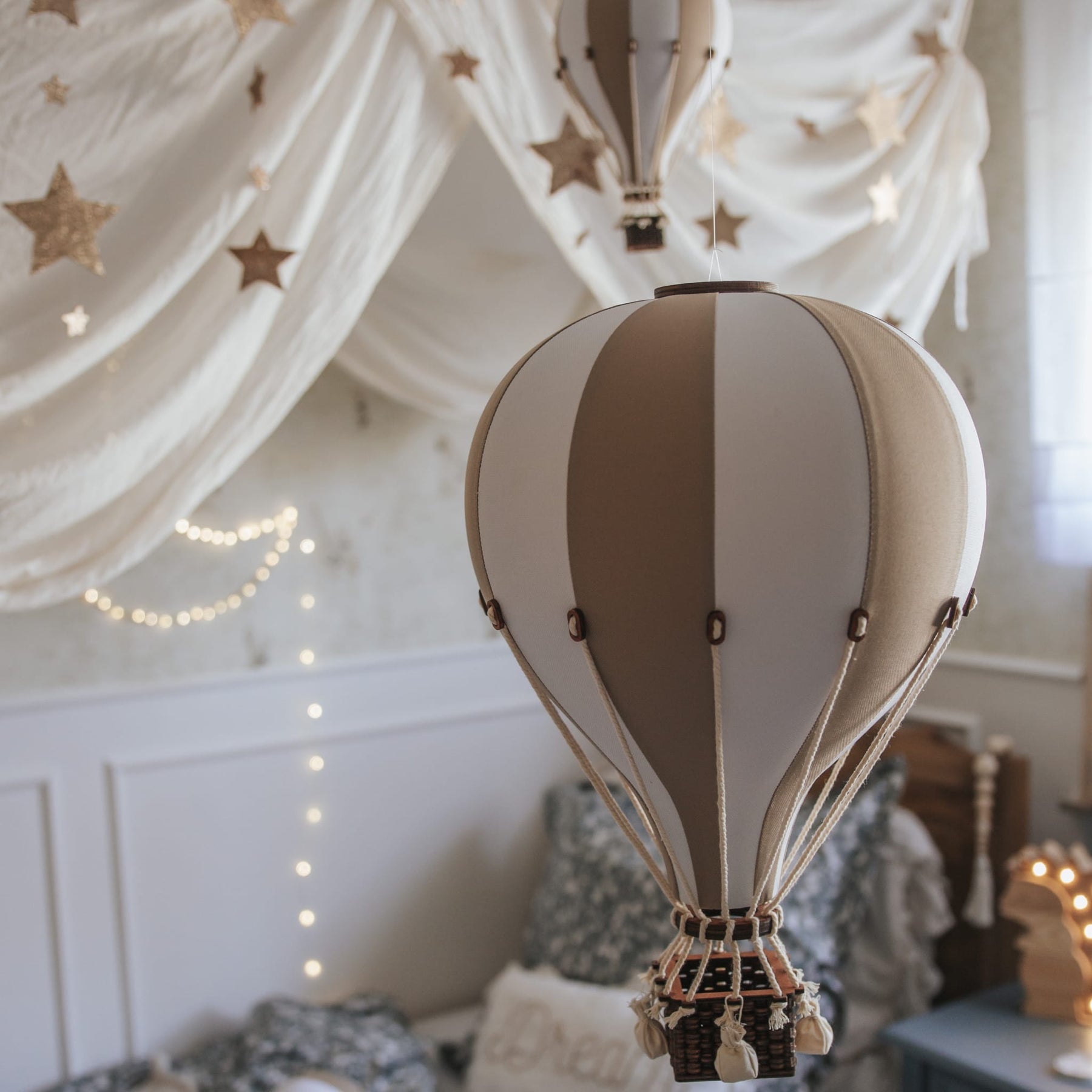 Der Heißluftballon ist ein ganz besonderes Dekostück im Kinderzimmer. Darüber hinaus eignet er sich zu verschiedenen Anlässen – zum Kindergeburtstag oder zum Verschenken. Dieses Einrichtungsdetail schafft eine zauberhafte Atmosphäre und ist deshalb bei der Raumgestaltung ein echter Hingucker.  Der handgefertigte Heißluftballon “Beige / Vanille“ von Super Balloon überzeugt mit seinem stabilen Material, seiner dezenten Farbmischung und einzelnen Elementen. Der Ballon-Korb wird aus Holz hergestellt, genauso wie der obere Ballonabschluss auf der Oberseite des Ballons, an dem die Fäden befestigt sind. Den Korb können Sie verzieren und individuell gestalten, wie etwa mit einem kleinen Papierschmetterling. Der Ballon hat im Inneren einen kugelförmigen Gummischlauch, muss manuell mit einer separat erhältlichen Ballpumpe aufgeblasen und von Zeit zu Zeit wegen des Luftverlustes auch nachgepumpt werden. Der Ballon ist ganz leicht und lässt sich einfach an einer Angelschnur befestigen.