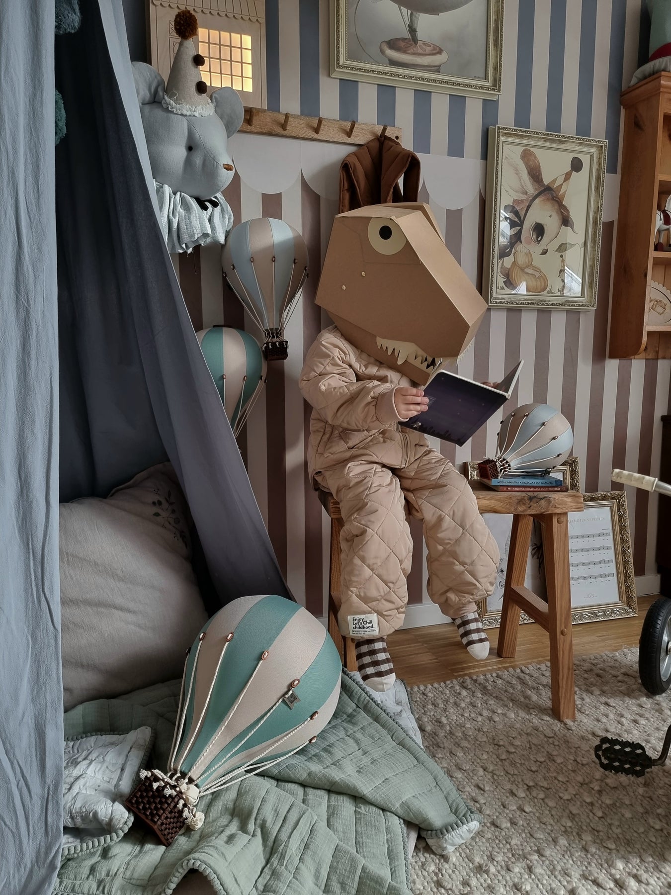 Willkommen in der magischen Welt der Heißluftballons! Besonders für Deko-Liebhaber sind sie zweifelsohne ein Deko-Highlight im Kinderzimmer. Bei Raum- und Gartengestaltung sieht der handgefertigte Heißluftballon “Pastel Green/Beige“ L zusammen mit anderen Super Balloon's verschiedener Größen und Farben noch spektakulärer aus. Er hat aber nicht nur reine Dekofunktion bei der Gestaltung des Kinderzimmers, sondern kommt bei verschiedenen Anlässen gut an – als Geburtstagsballon, als Ballon zur Baby-Shower oder zum Verschenken. Dieses Einrichtungsdetail schafft eine märchenhafte Atmosphäre und ist deshalb ein echter Hingucker. Es überzeugt mit seinem stabilen Material, seiner zarten Farbmischung und einzelnen Elementen. Der Ballon-Korb wird aus Holz hergestellt, genauso wie der obere Ballonabschluss, an dem die Fäden befestigt sind. Der Ballon hat im Inneren einen kugelförmigen Gummischlauch, muss manuell mit einer separat erhältlichen Ballpumpe aufgeblasen und von Zeit zu Zeit auch nachgepumpt werden. Der Ballon ist ganz leicht und lässt sich einfach an einer Angelschnur befestigen.