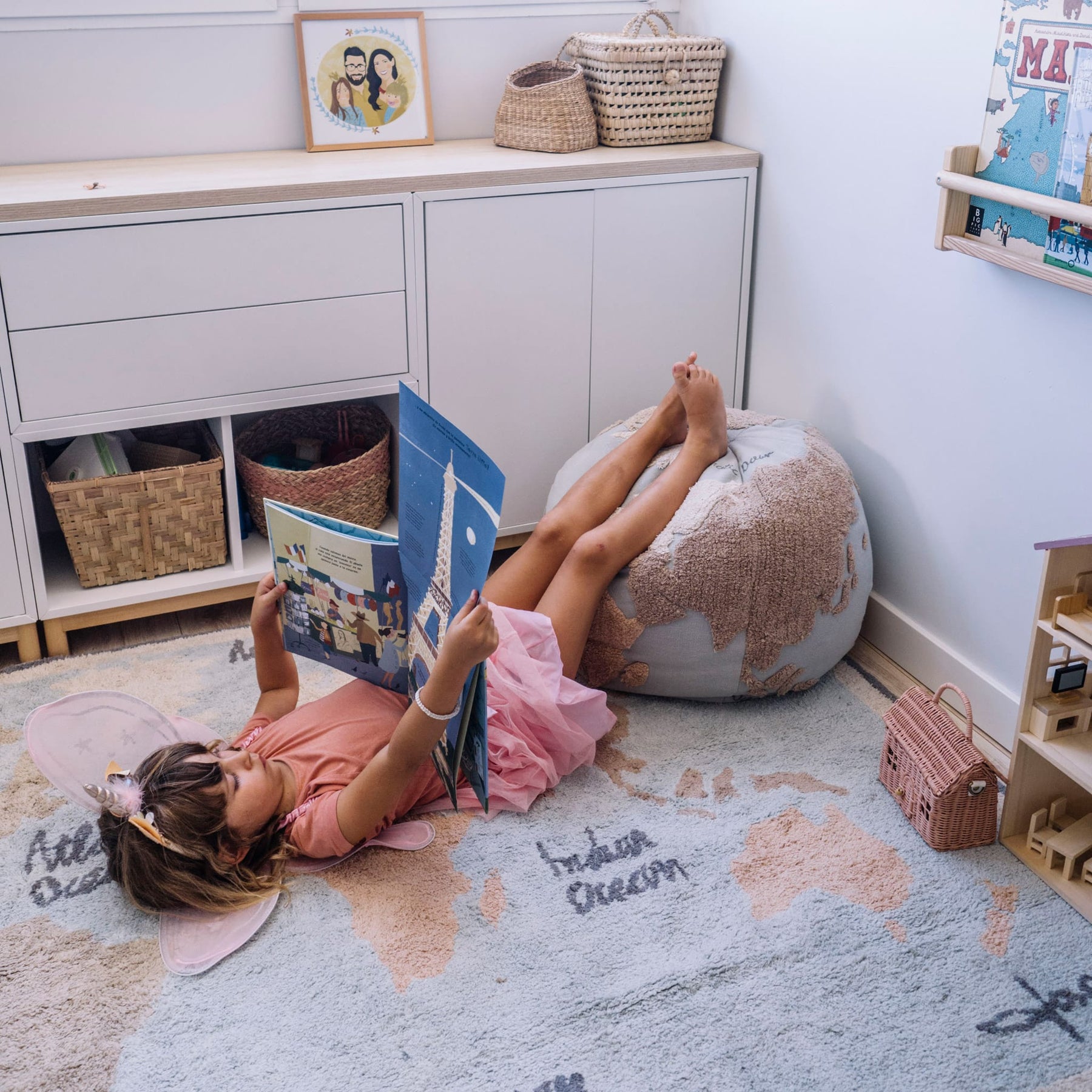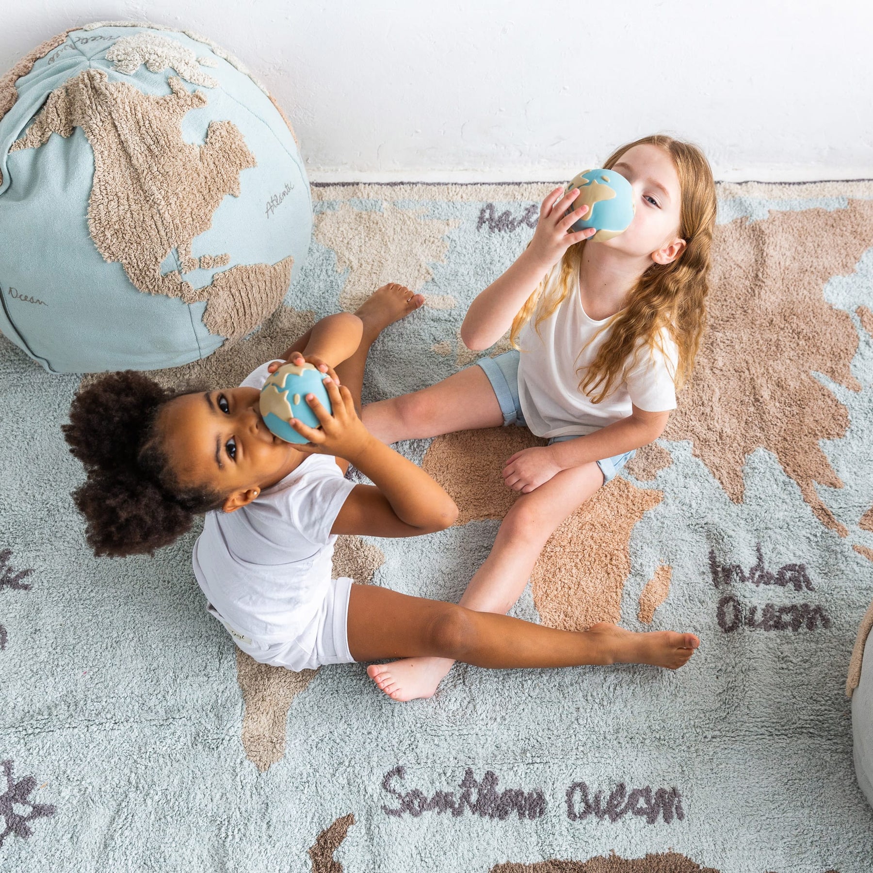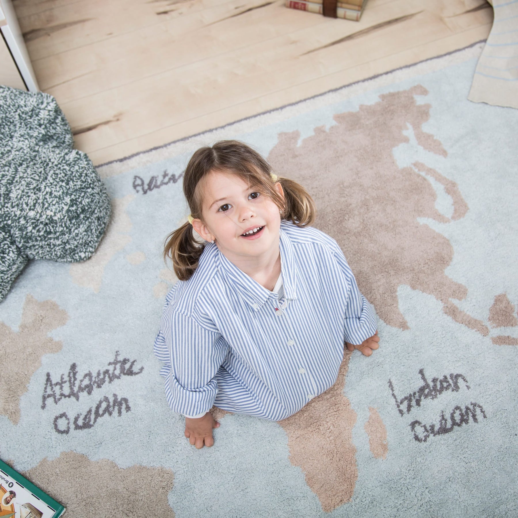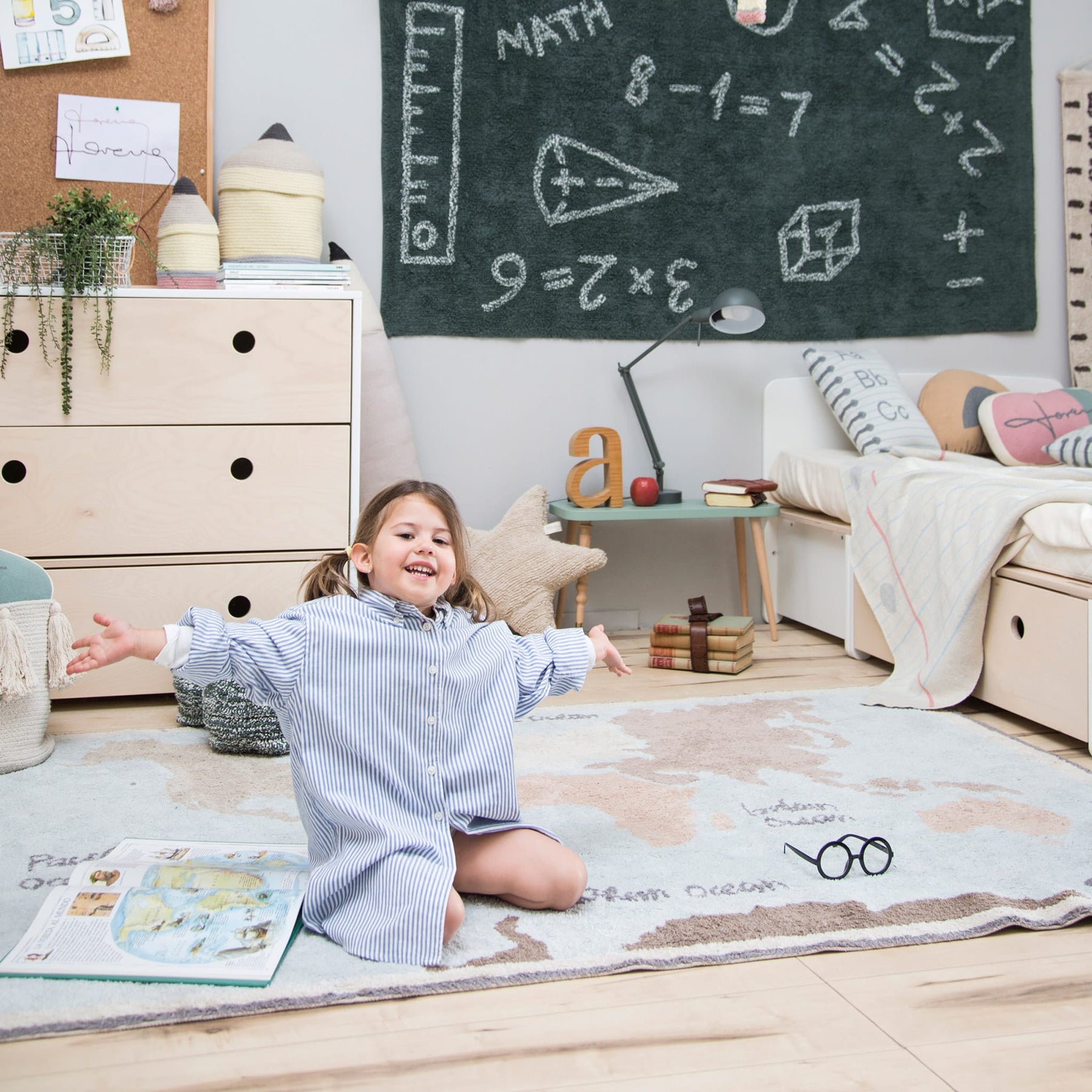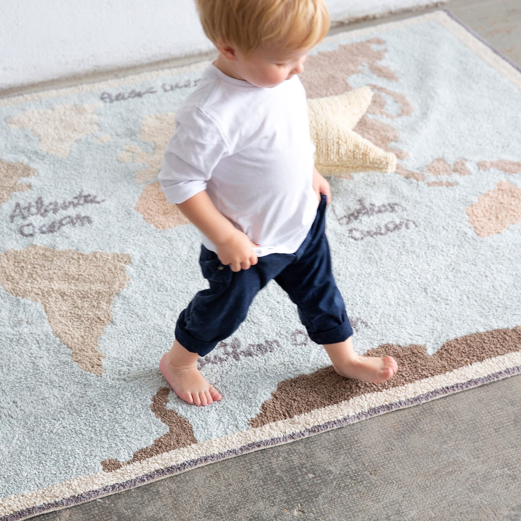 Mit dem wunderschönen maschinenwaschbaren Baumwollteppich “Vintage Map” können Kinder die Kontinente und Oceans und ihre Positionierung kennenlernen! Als fabelhaftes dekoratives Detail passt der Teppich in rechteckiger Form sowohl in Wohn-, Baby-, Kinder- oder Arbeitszimmer als auch in geräumige Vorzimmer oder Salons. Der große Vintage Map Teppich ist gleichzeitig als Bodenteppich und Wandteppich entwickelt. Er besteht aus Baumwolle, was ihn extrem weich und warm und somit ideal für kalte Tage macht. Die Baumwolle macht den kleinen Teppich aber auch sehr praktisch in den Sommermonaten, weil das Raumklima durch Naturmaterialien reguliert wird. Das Teppichunikat “Vintage Map” in schönen Vintage Pastell-Farben wurde komplett in Handarbeit hergestellt und schafft eine frische und angenehme Atmosphäre im Raum. Die Weltkarte von Lorena Canals für jedes stilvolles Zimmer und sauberen Haushalt!