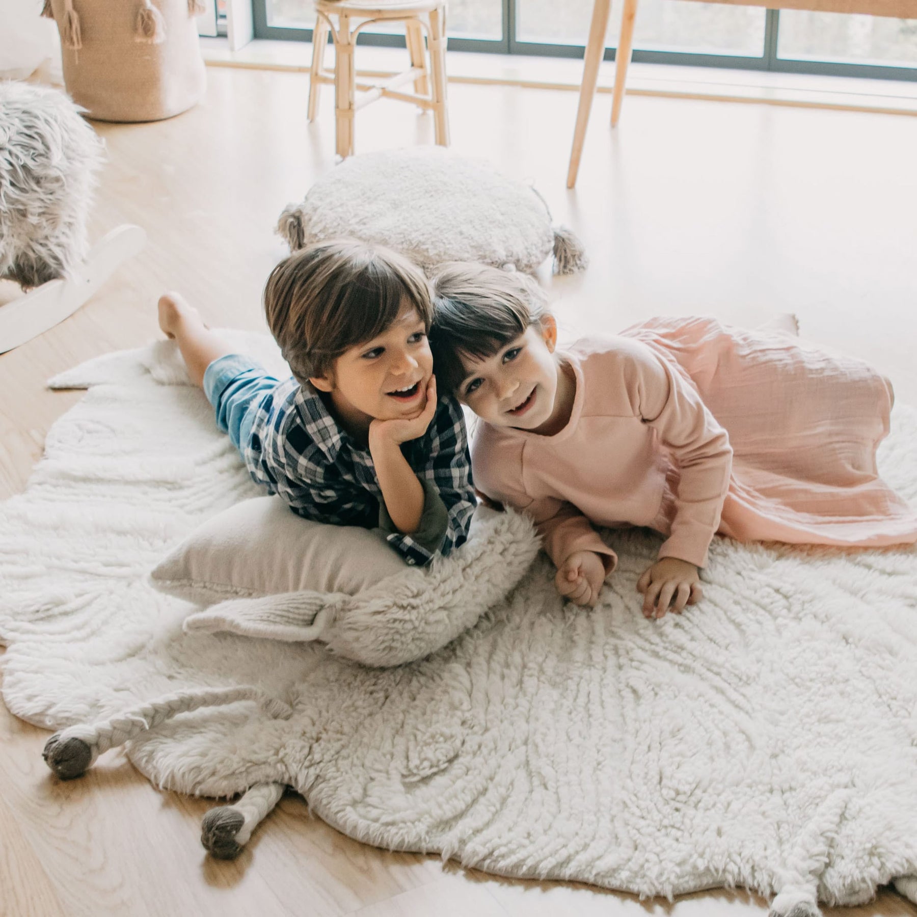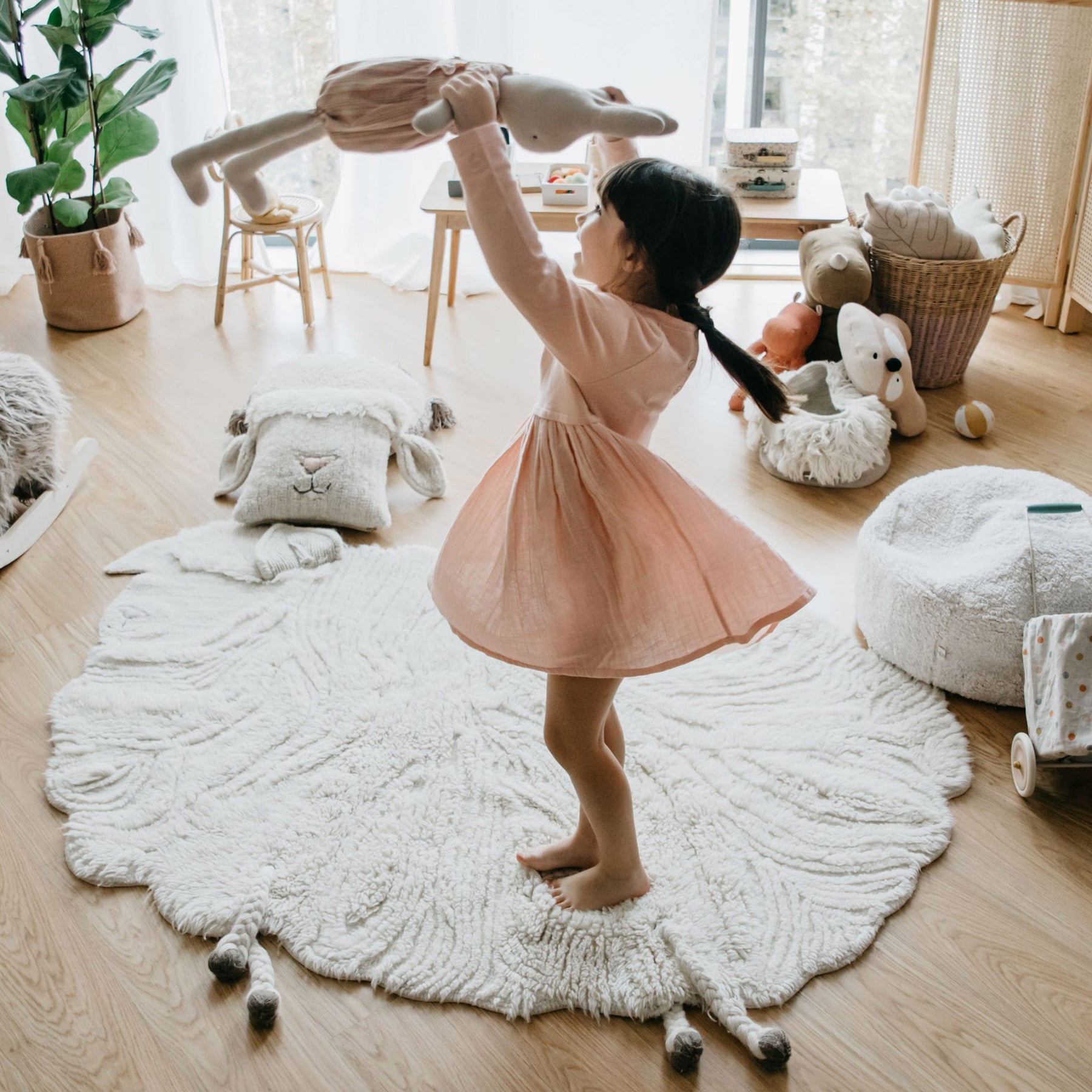 Mäh, mäh, kleines weißes Schaf! Mit dem maschinenwaschbaren Wollteppich “Pink Nose Sheep” kommt der naturinspirierte Look in das Kinderzimmer Ihres Kindes! Als wunderschönes dekoratives Detail passt der schafförmige Teppich in der schönen naturweißen Farbe in jedes Zimmer des Hauses. Der multifunktionale, interessante und äußerst praktische Teppich bietet viele Einsatzmöglichkeiten. Er eignet sich als Spielmatte, als dekoratives Detail oder als Vorleger vor dem Bett. Er besteht aus 100% Wolle, was ihn extrem weich und warm und somit ideal für kalte Tage macht. Das Teppichunikat “Pink Nose Sheep” wurde komplett in Handarbeit hergestellt und schafft eine frische und angenehme Atmosphäre im Raum. Der hochwertige Teppich hat sehr hohe Langlebigkeit und ist einer der haltbarsten Teppiche auf dem Markt. Im Umfang wird eine Baumwolltasche für die Aufbewahrung und eine kostenfreie rutschfeste Unterlage enthalten.