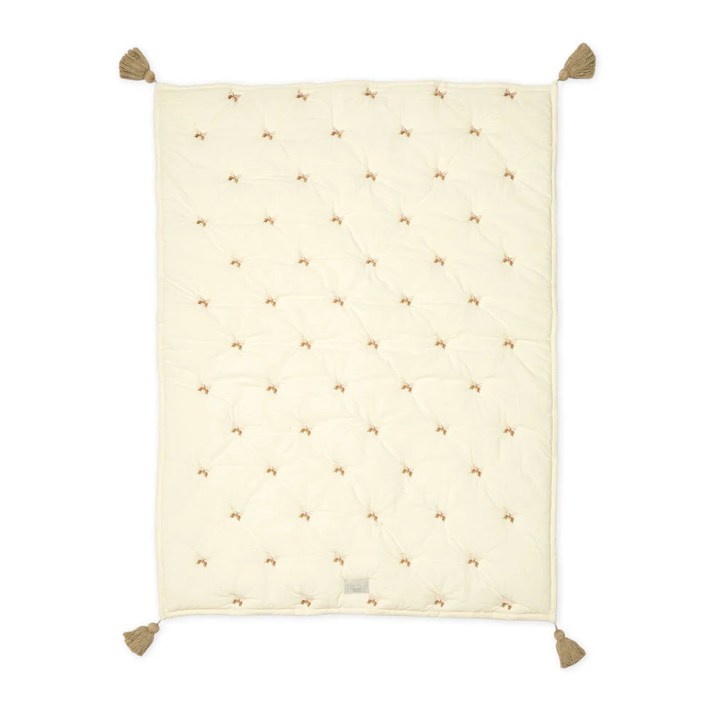 Eine zarte, bestickte Decke in weicher Bio-Baumwolle, die mit eleganten Quasten und süßen, handgezeichneten Motiven von Cam Cam verziert ist. Diese Decke verleiht dem Kinderzimmer eine charmante und behagliche Atmosphäre. Dick gepolstert, eignet sie sich perfekt für gemütliche Momente am Boden oder als dekorative Decke für das Bett. Sie lädt zum Kuscheln ein und sorgt für Wärme an kalten Tagen. Das zeitlose Design und die feine Textur machen sie zu einem vielseitigen Accessoire, das jedes Kinderzimmer stilvoll ergänzt. Passt hervorragend zu unserem bestickten Kissen und ist ein ideales Geschenk für kleine Abenteurer.