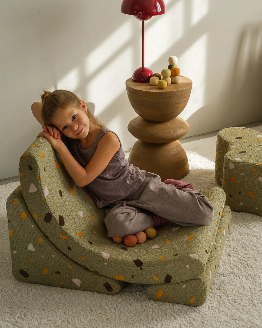 Der Wigiwama Moon Kindersessel vereint durchdachtes Design mit spielerischer Funktionalität und wird schnell zum Lieblingsstück im Kinderzimmer. Mit seiner dreiteiligen, klappbaren Konstruktion lässt sich der Sessel im Handumdrehen in eine bequeme Liegefläche oder eine kreative Spiellandschaft verwandeln – perfekt zum Lesen, Entspannen oder fantasievollen Spielen.