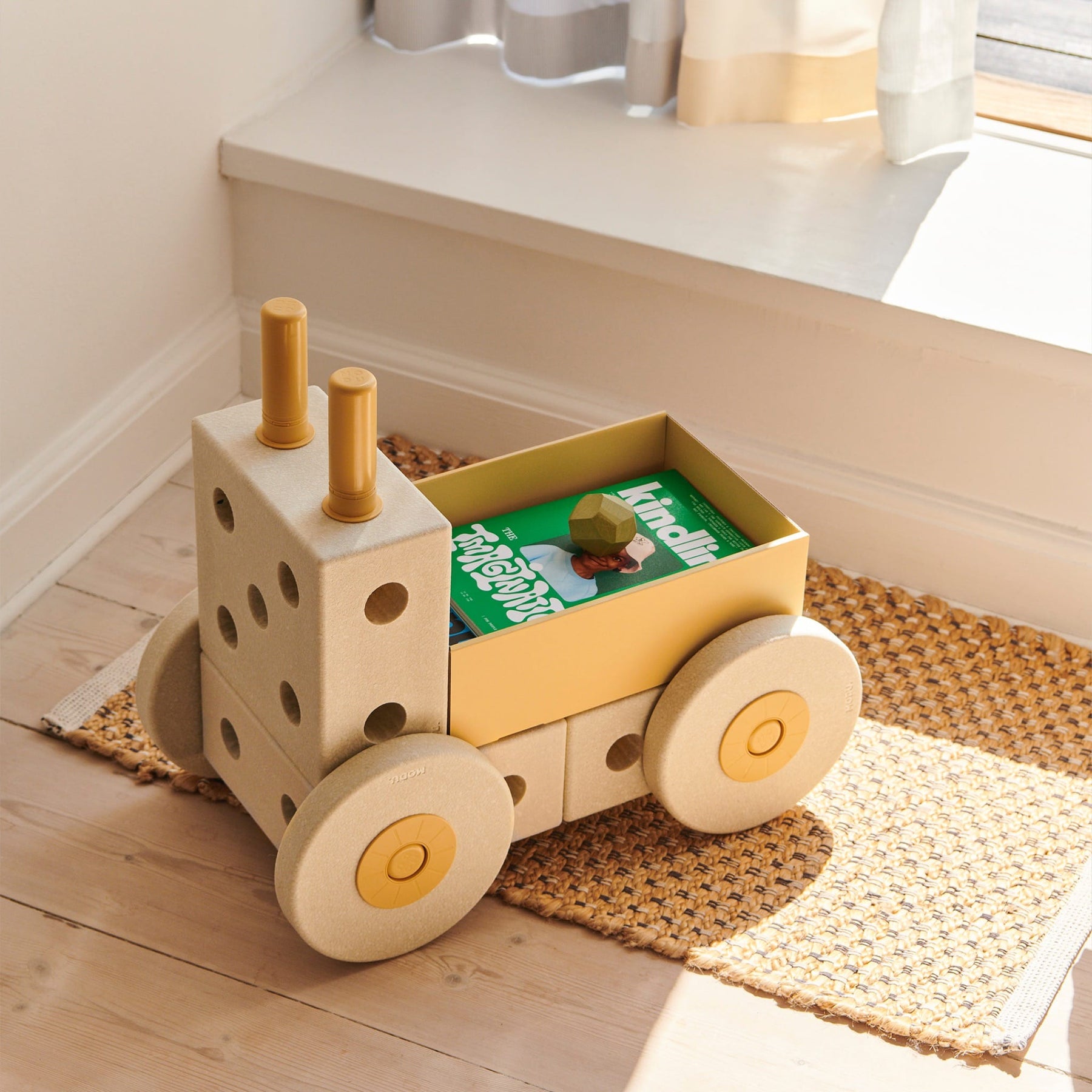 • 22 Elemente: 3 Blöcke, 14 Verbinder, 4 Schaumstoffräder, 1 Box
