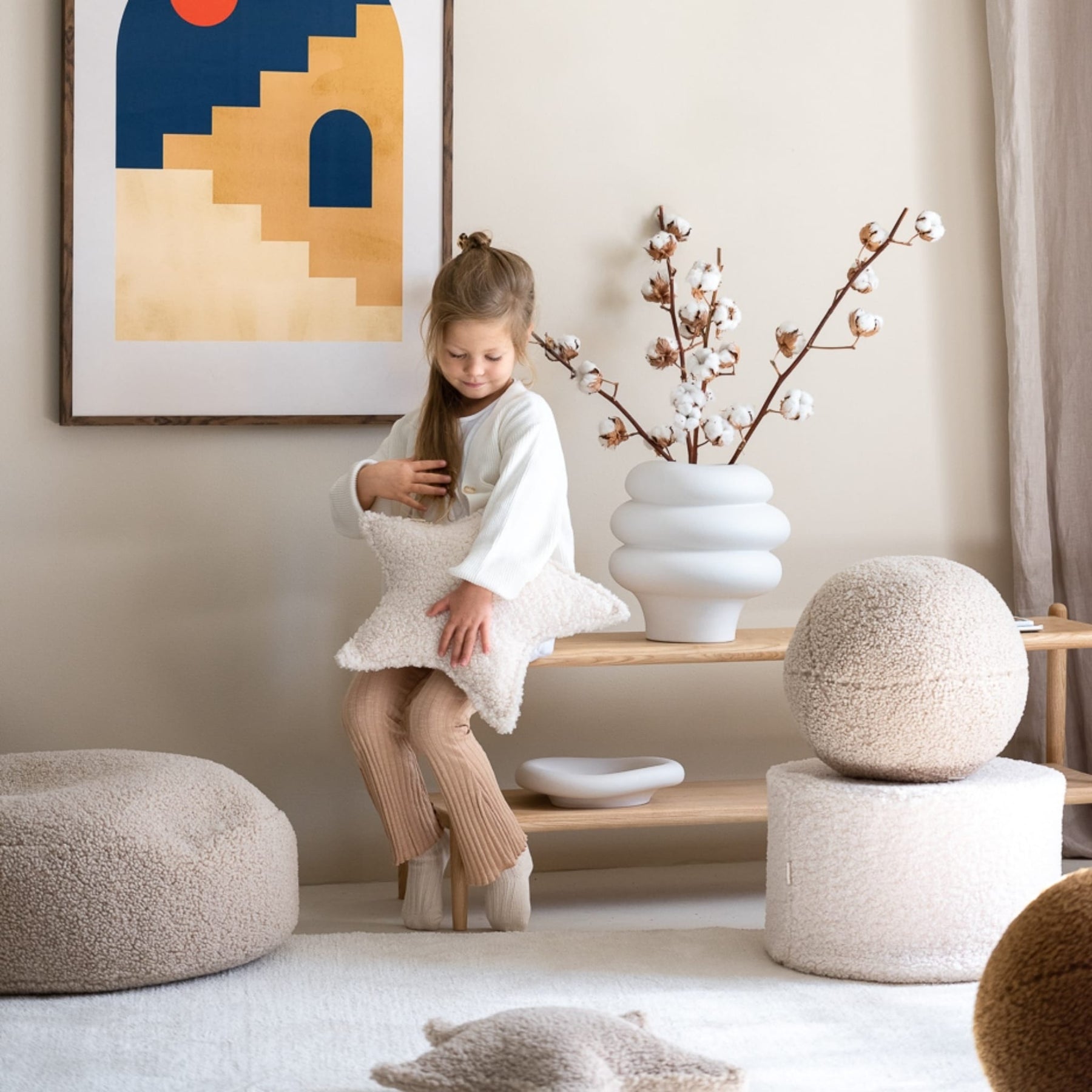Der Wigiwama Sitzpuff ist ein vielseitiger Alleskönner für das Kinderzimmer: Ob als bequeme Fußstütze, zusätzliche Sitzgelegenheit oder Baustein für fantasievolle Spielhöhlen – dieser leichte und weiche Pouf ist immer zur Stelle.