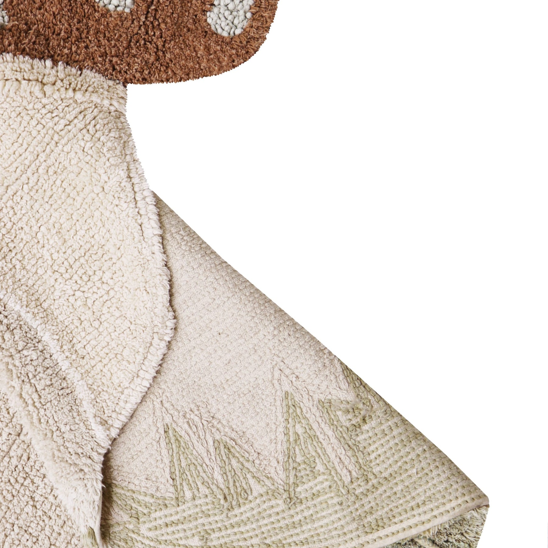 Der waschbare Teppich "Boletus" aus der Mushroom Hunt Kollektion von Lorena Canals ergänzt jeden Raum auf charmante Weise. Er zeigt einen großen und einen kleinen Pilz auf einem weichen, getufteten Flor in Kastanien- und Olivfarben. Die leicht unregelmäßigen Punkte auf dem Teppich werden in der Chenille-Technik hergestellt, was ihm eine zusätzliche Textur verleiht. Die zusätzlich eingeflochtenen Zöpfe am unteren Rand und die Reihen von etwas längeren Florfasern verleihen diesem Kinderteppich das gewisse Extra.