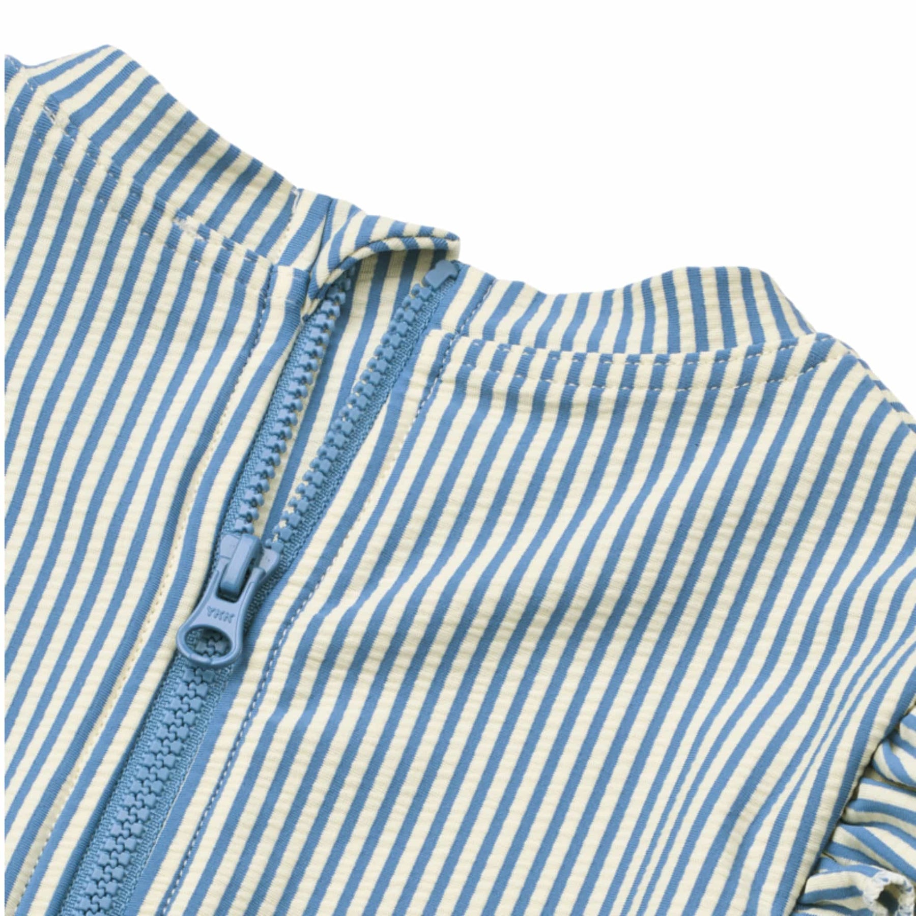 Der langärmelige LIEWOOD Badeanzug mit Rüschendetails vereint verspieltes Design mit zuverlässigem Sonnenschutz. Dank UV-Schutzfaktor 40+ schützt er die empfindliche Kinderhaut optimal bei sonnigen Tagen am Strand oder im Schwimmbad.