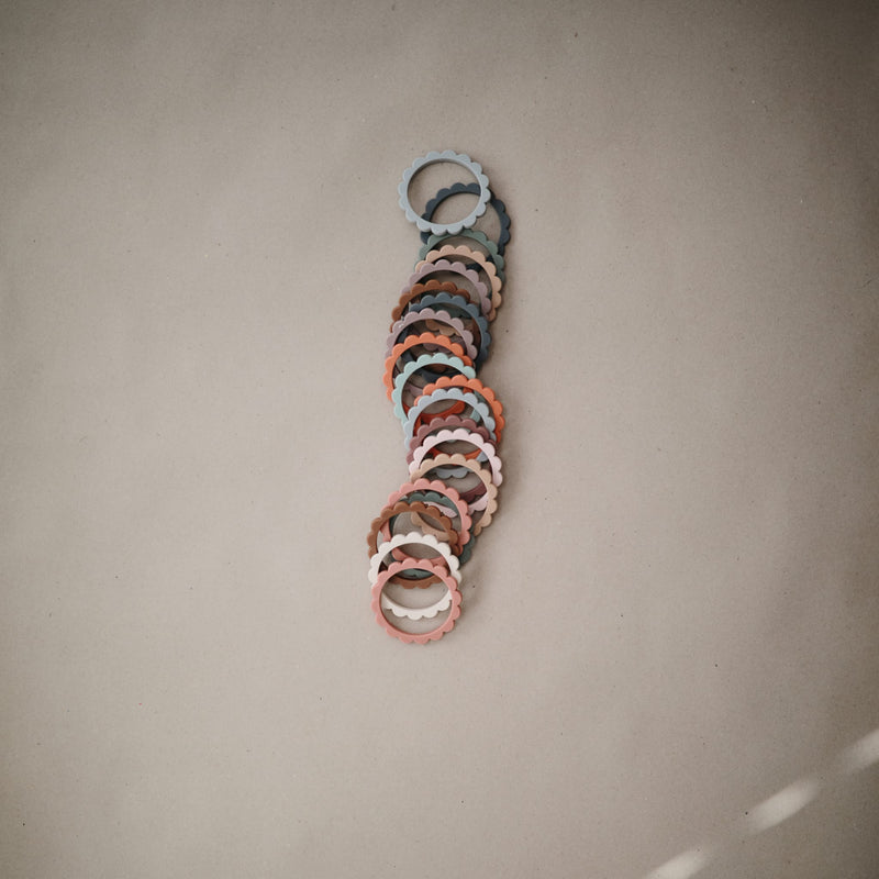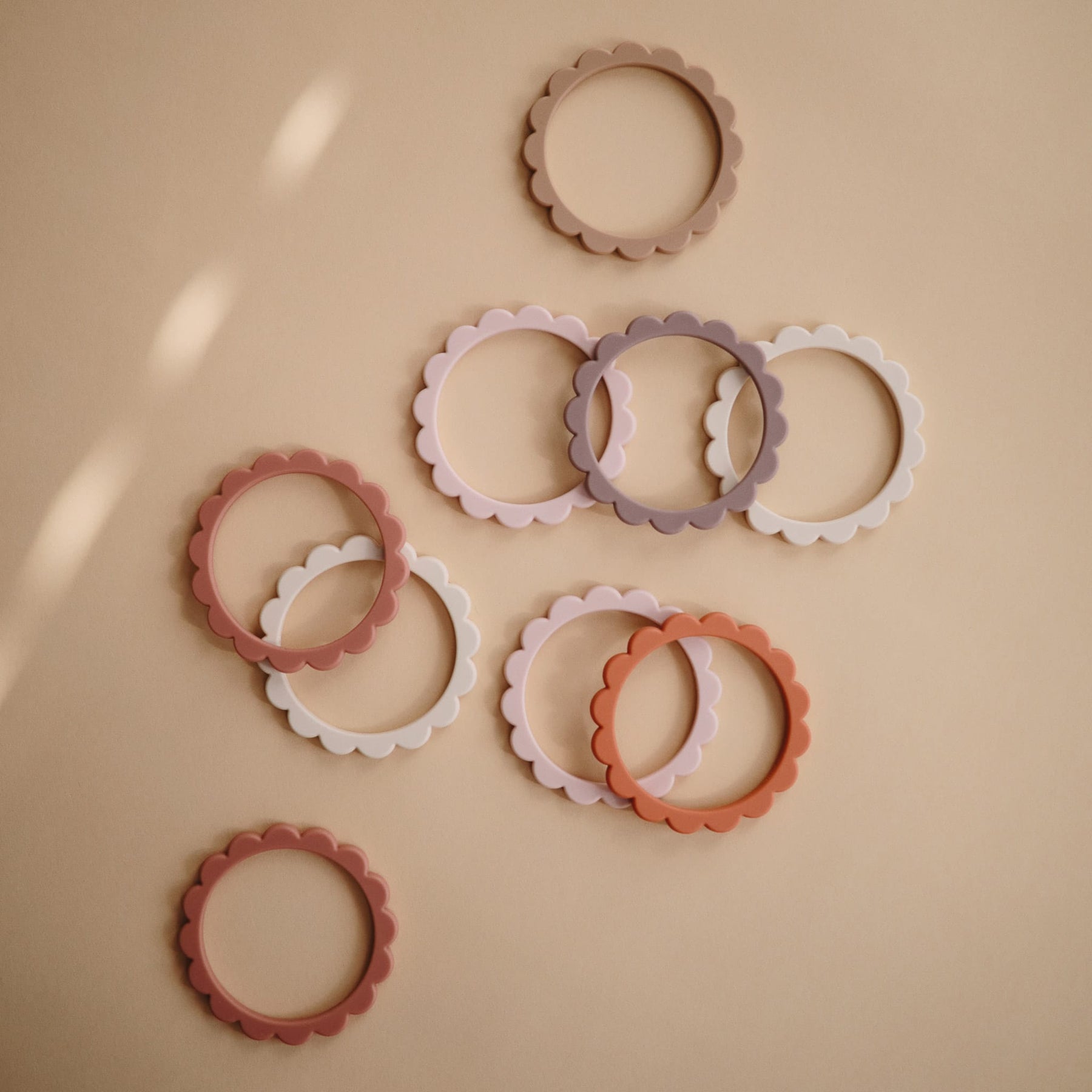 Die Beißringe “Flower Steel / Dove Grey / Stone” von Mushie tun vielen Säuglingen gut und sind eine wichtige Hilfe bei zahnenden Babys. Das Set besteht aus drei verschiedenfarbigen und weichen Ringen in Blütenform. Mit ihrer Textur beruhigen die Ringe das Zahnfleisch Ihres Kindes und sorgen für ein schmerzfreies Zahnen. Die Beißringe haben passende Größe, die für Babys sehr gut zu greifen ist. Das ungiftige und antibakterielle Silikon trägt zur Lebensqualität bei und ist absolut sicher für Säuglinge. Dieser Beißring ist multifunktional und eignet sich hervorragend zur Linderung von Zahnfleischschmerzen, zum Greiftraining oder als Accessoire um das Handgelenk.