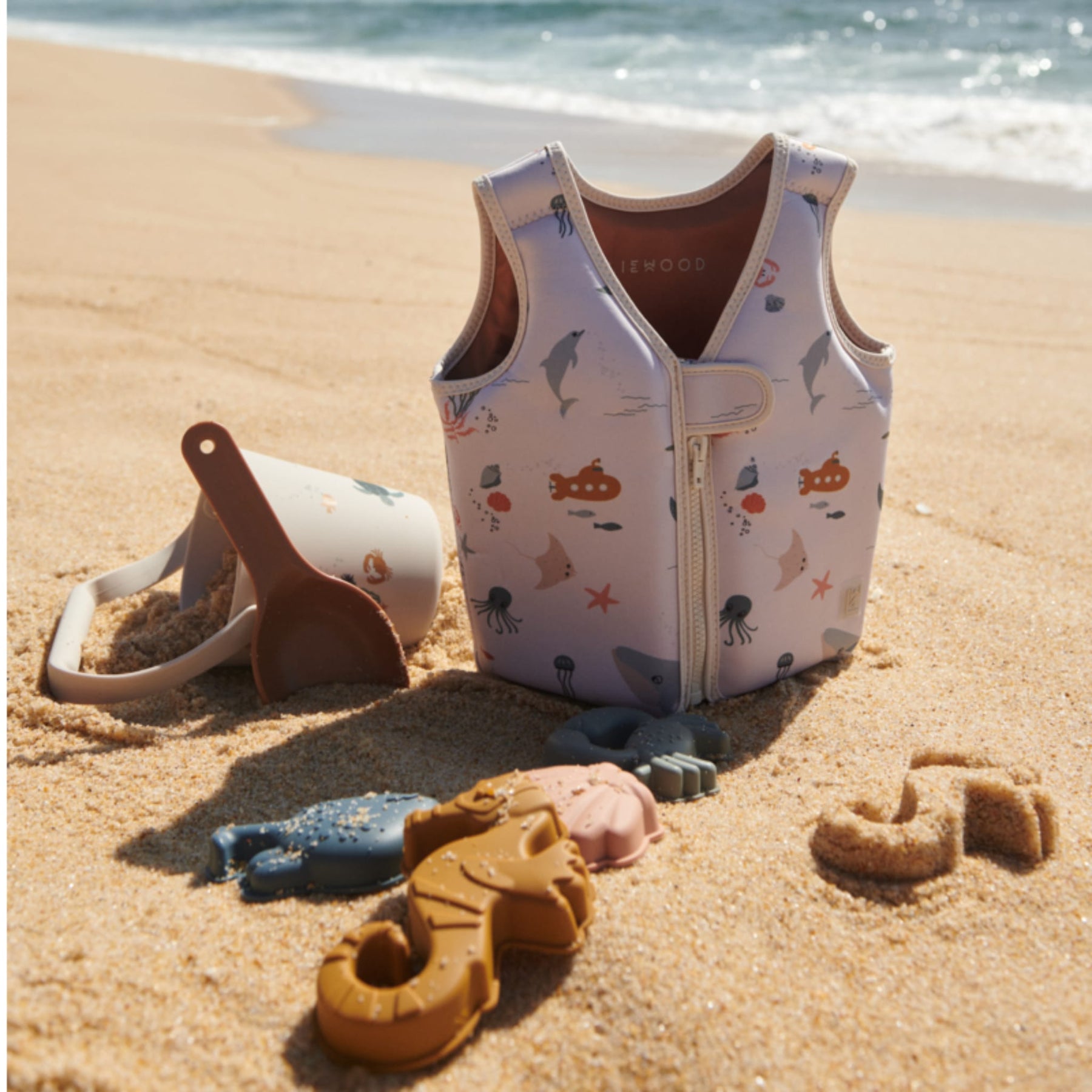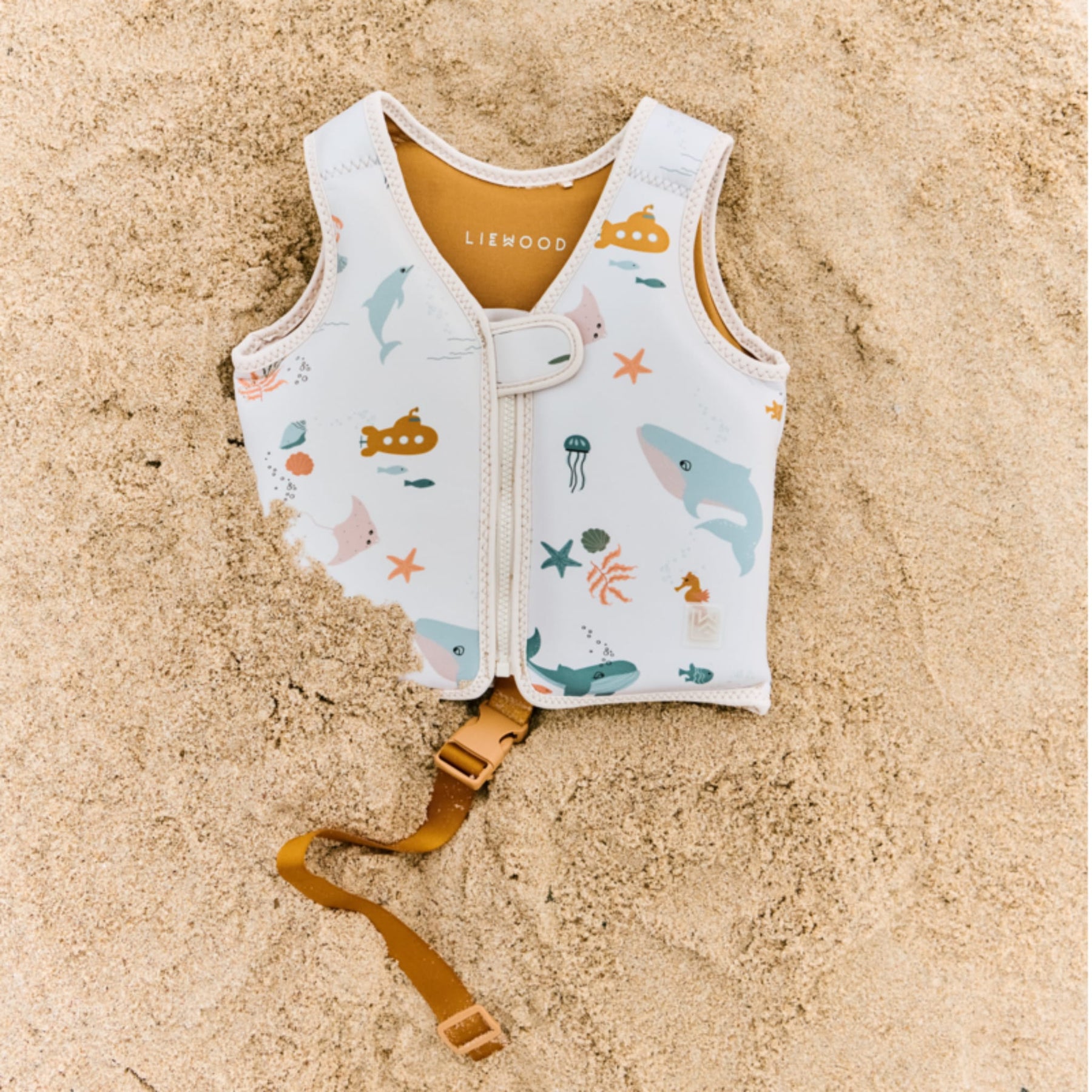 Die Liewood zauberhafte Kinder-Schwimmweste “Dove Sea creature / Sandy” ist eine großartige Möglichkeit, Ihr Kind an das Wasser heranzuführen und ihm das Schwimmen beizubringen. Dank des leichten und flexiblen Materials ist die Weste nicht sperrig und gewährleistet optimale Bewegungsfreiheit. Aus 100% Neopren hergestellt, bietet sie eine perfekte Passform und einen hohen Tragekomfort, so dass Ihr Kind die ersten Schwimmübungen genießen und sich sicher mit dem Wasser vertraut machen kann. Damit die Weste an Ort und Stelle bleibt, ist sie mit einem Reißverschluss auf der Vorderseite, einem verstellbaren, mattem Gurtband zwischen den Beinen und einer gummierten Schnalle ausgestattet. Ein besonderes Design-Element ist das aufgedruckte Liewood-Branding, welches der Weste eine modische Note verleiht. Lassen Sie jetzt Ihr Kind die Welt des Wassers entdecken. Ab ins Wasser!