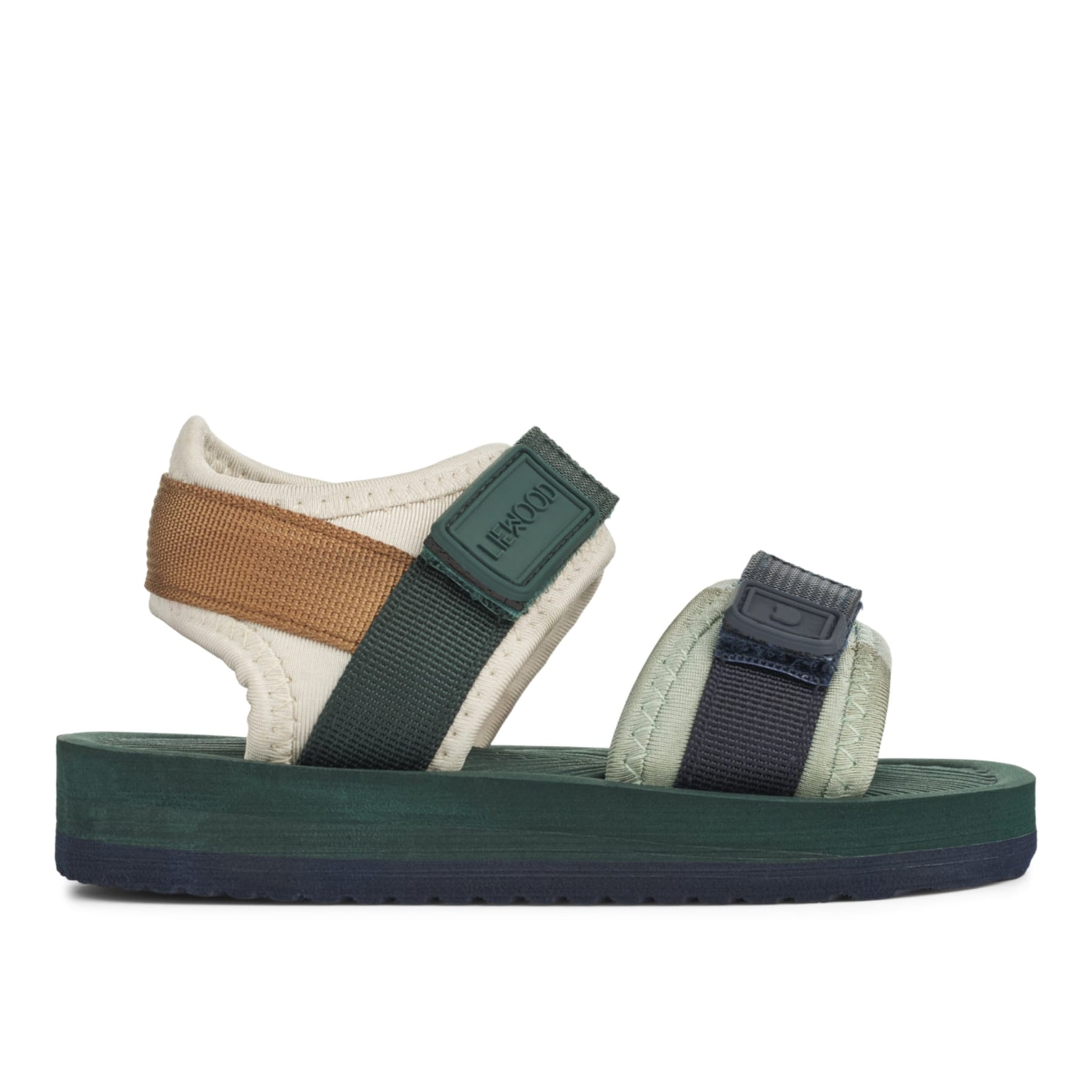 Die Sandalen "Monty Hunter Green Mix" von Liewood sind perfekt für aktive Sommerzeit geeignet und bieten den ganzen Tag über ein angenehmes Tragegefühl. Ein verstellbarer Riemen, der um die Ferse herumgeht, sorgt für einen sicheren Sitz. Mit einem Klettverschluss am Knöchel und am Vorderfuß sind diese Sandalen die ideale Wahl für einen Tag am Strand oder einen Ausflug.